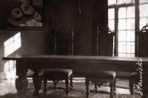 Wnętrze kopenhaskiego mieszkania Jarosława Iwaszkiewicza. Na pierwszym planie simmlerowskie fotele, duński stół (późniejszy katafalk J.I.), w tle obraz Kamila Witkowskiego ,,Dynie”. Kopenhaga 1932r.