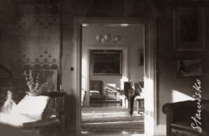Wnętrze kopenhaskiego mieszkania Jarosława Iwaszkiewicza. W głębi obraz Rafała Malczewskiego ,,Pejzaż górski”. Kopenhaga 1932r.